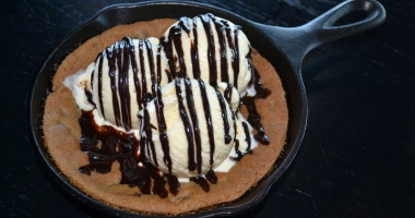 Warm chocolate chip cookie topped with vanilla ice cream and Ghirardelli chocolate drizzle
