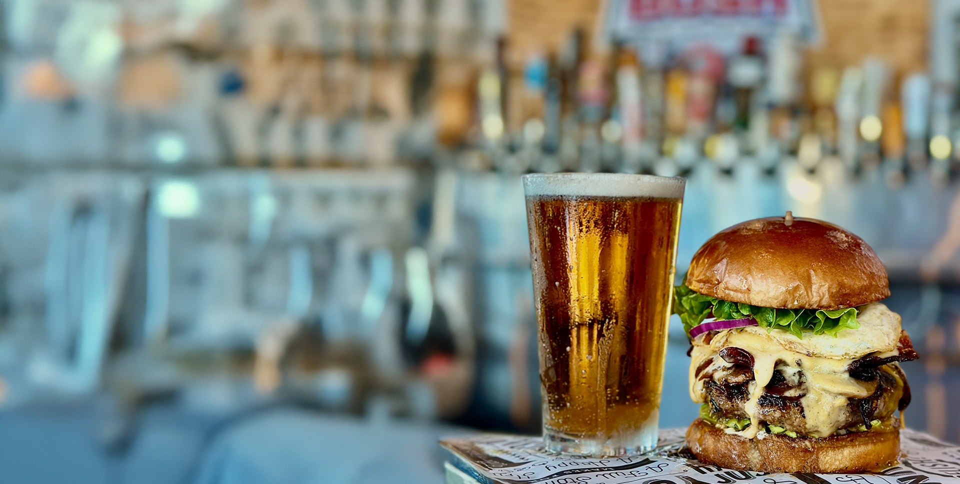 Hearty 1/2 lb burger loaded with savory grilled mushrooms, caramelized onions, crispy bacon, melted sharp cheddar, Swiss, and pepper jack cheeses, fried egg, and fresh avocado.