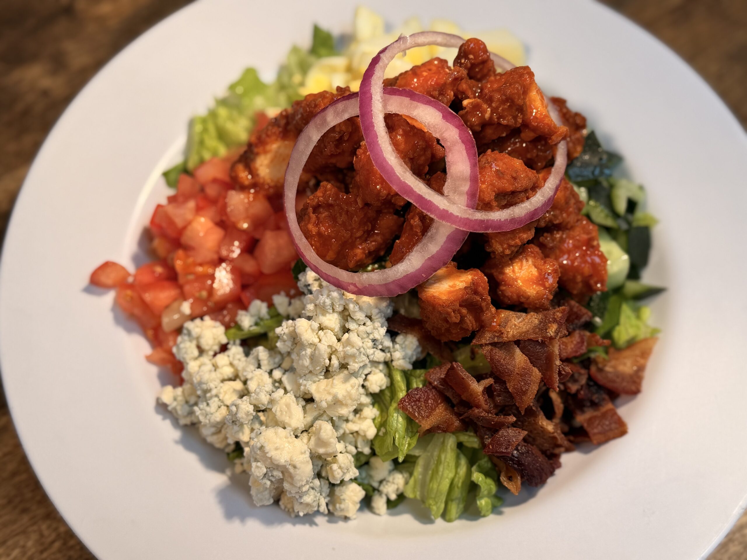 Chopped fresh romaine lettuce, diced tomatoes, crispy bacon, chopped egg, diced cucumbers, purple onions, and crumbled blue cheese Served with marinated grilled or fried chicken tossed in buffalo sauce