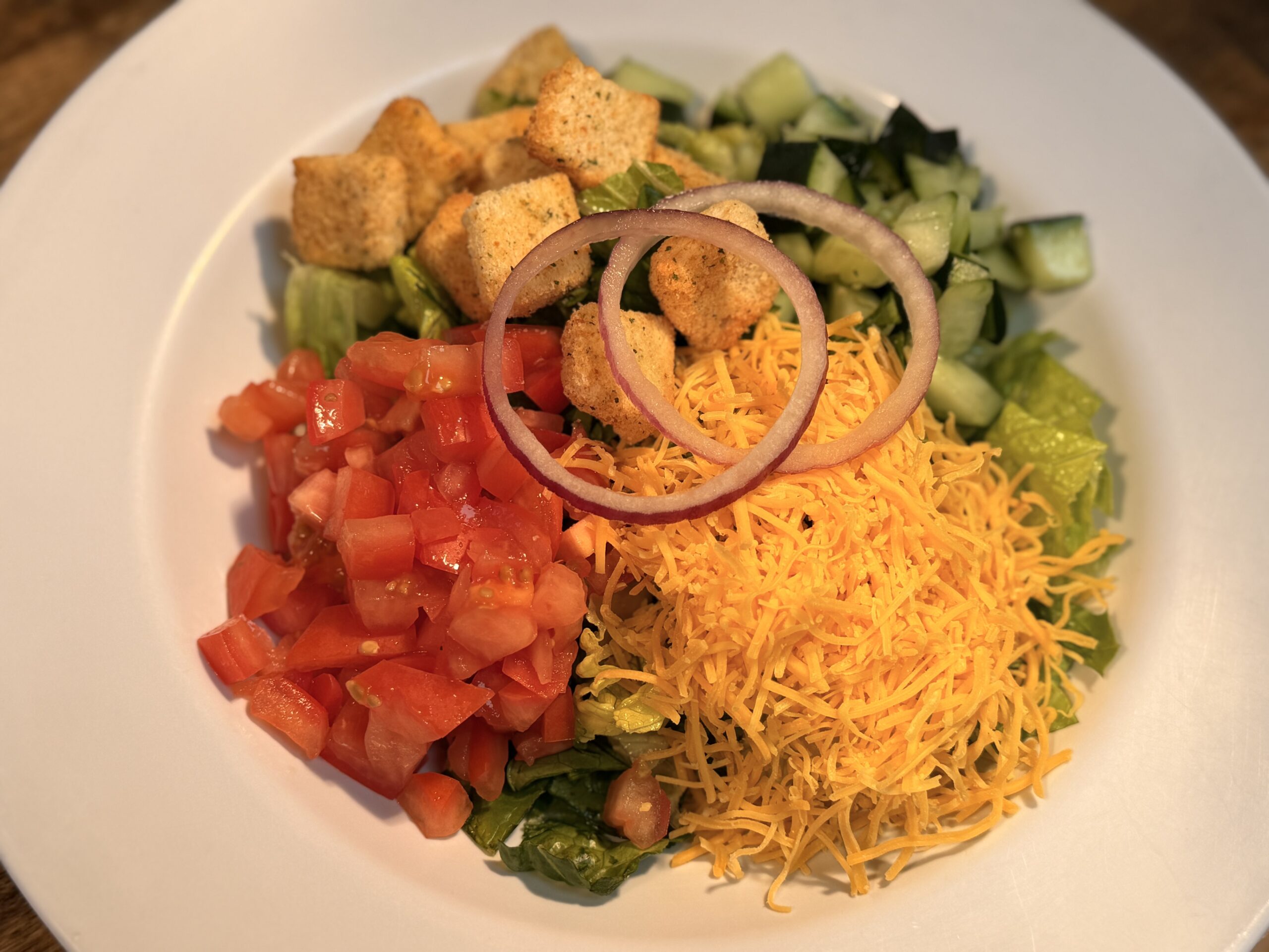 Our house salad with fresh romaine lettuce, diced cucumbers and tomatoes, shredded cheddar, croutons, and purple onions Full /Side