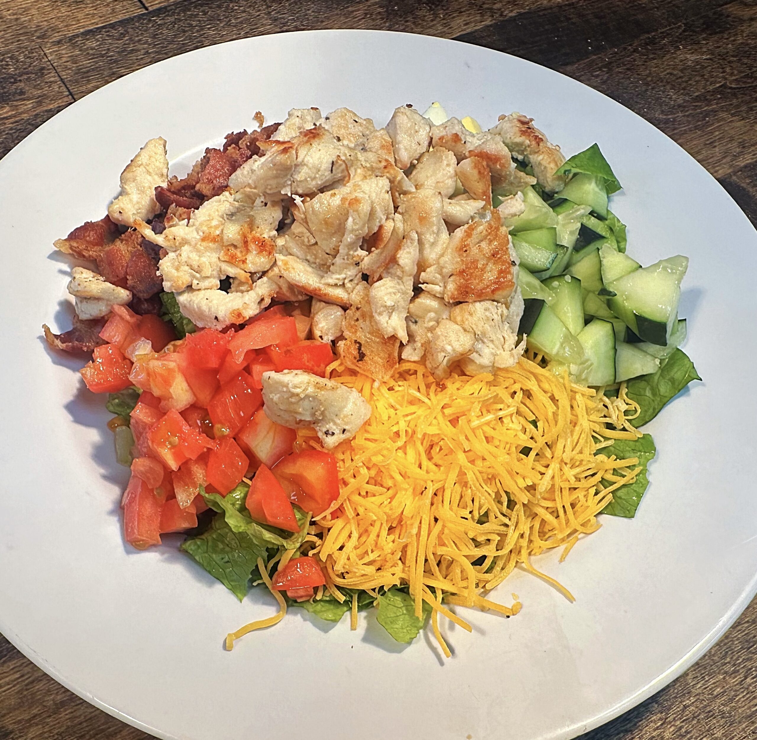Fresh romaine lettuce, crispy or grilled marinated chicken, diced egg, chopped cucumbers and tomatoes, shredded cheddar, and crumbled crispy bacon