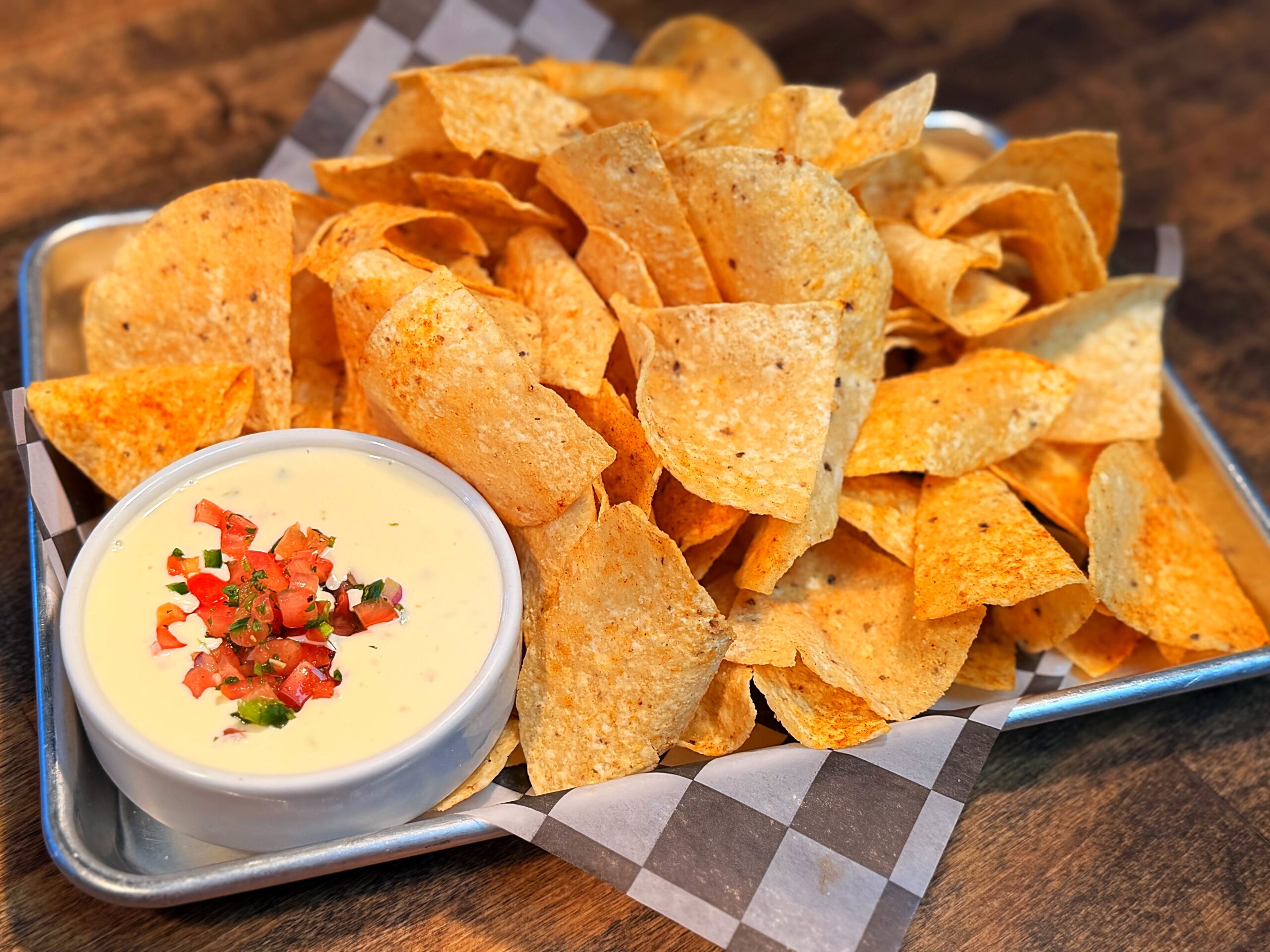 Crispy tortilla chips with creamy white queso topped with fresh pico de gallo